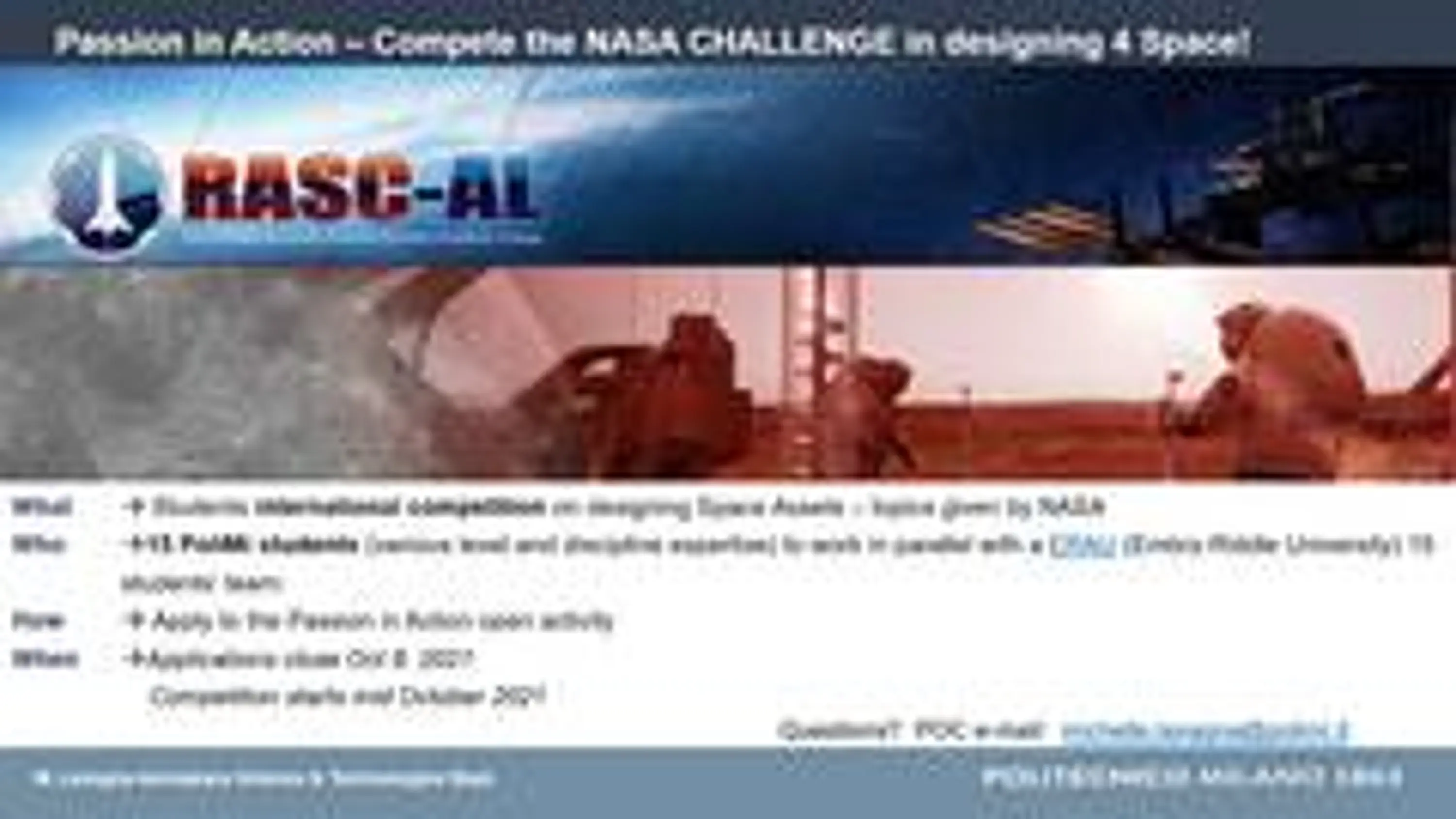 Students international competition on designing Space Assets – topics given by NASA - check here for details: http://rascal.nianet.org/