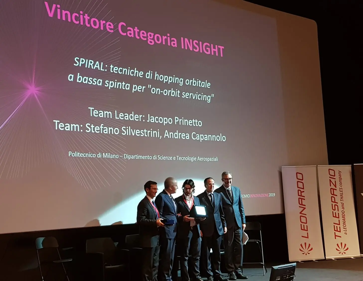 “The Spiral project from our DAER team - Prinetto, Silvestrini, Capannolo” won the first price at the #T-TeC (Telespazio Technology Contest) event in the Insight category, for orbit hopping modelling in support to on-orbit servicing.